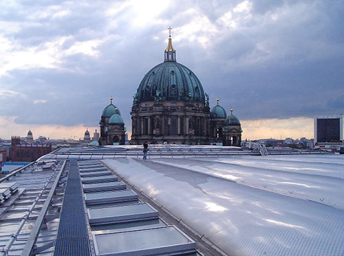 18 teilweise farbigen Verbundgläser als Dachverglasung tw. im Nachteinsatz mit entsprechenden Sicherheitsvorkehungen ausgetauscht.